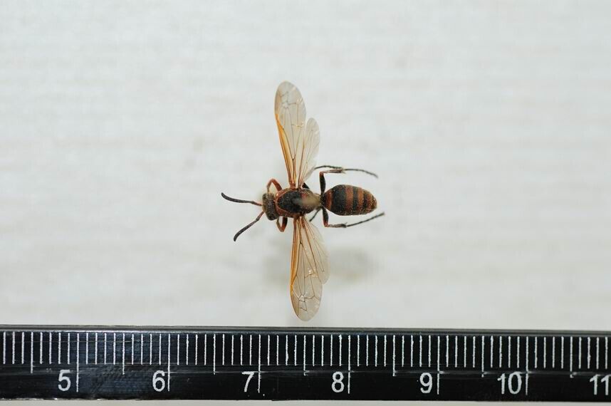 额部触角窝之间略隆起,额上半部及颅顶部黑色,布有较粗的刻点及黄色短毛,棕色单眼,额下部浅棕色。前胸背板前缘突起呈棕色。中胸背板全呈黑色,密布粗糙刻点及短毛。小盾片棕色,矩形,后小盾片向后下方倾斜,横带状。体长15毫米,雄蜂体长13毫米。 |