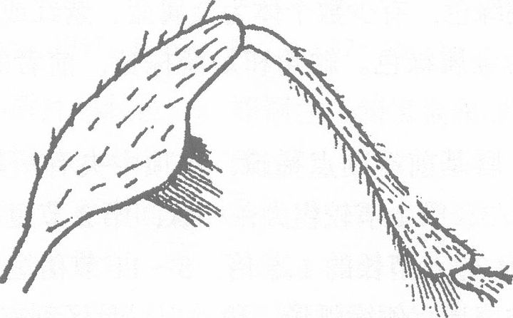 体狭长,体背密背淡黄色长毛,腹面毛疏短。雄虫体色较深,黑色,额