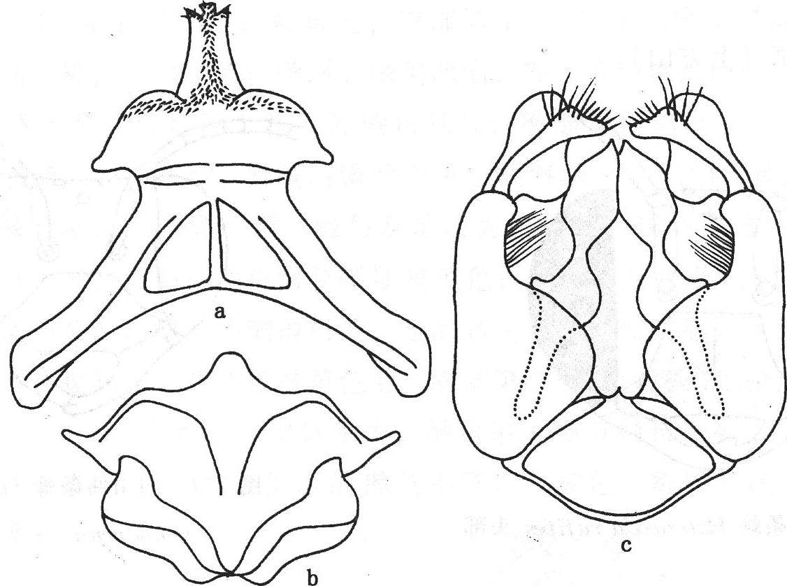 雄体长11mm;体黑色;头部具黄斑;体密被黄毛。唇基几光滑,表面刻点稀且粗大;上唇表面粗糙,端缘中央稍凹,两旁各具一小尖突;触角第1鞭节稍长于节2,第 (注:本种标本为Dr.R.w.Brooks借自美国自然博物馆提供作者研究用)1、2、3节的比例为4:3...