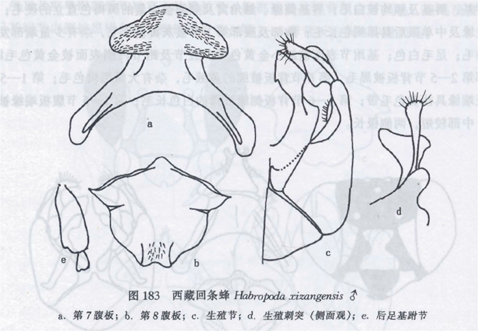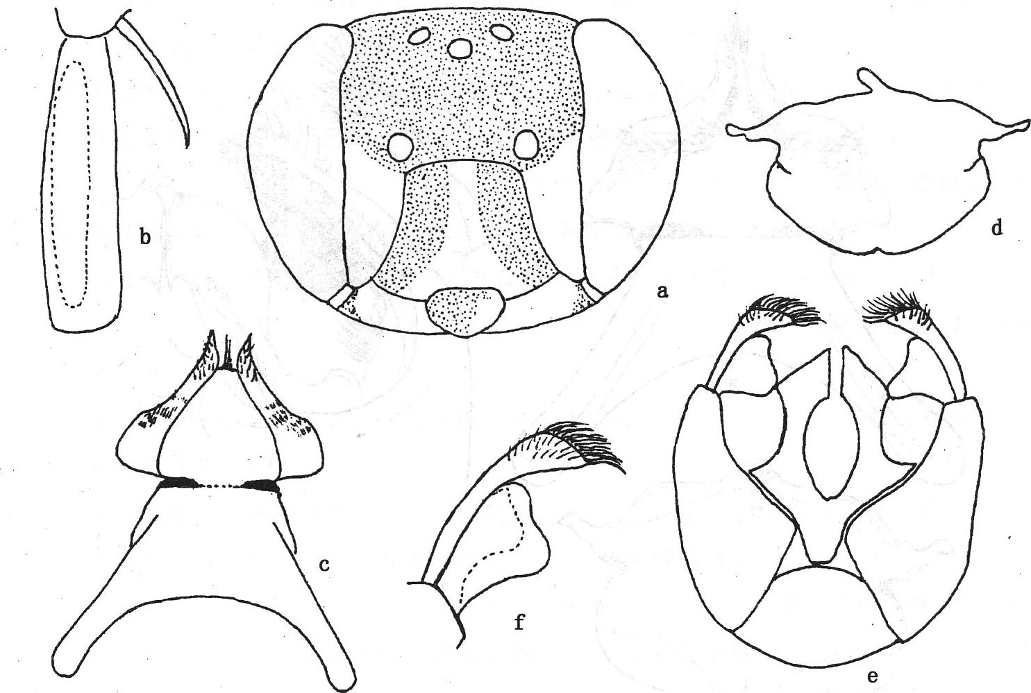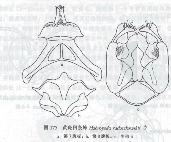 雌体长12mm;体黑色;头宽大(图168:b),具黄斑;腹部第2—4节背板被浅黄色毛带。头宽大,长与宽的比例为5.3:7.3;触角第1鞭节明显长于节2,第1、2、3、4节的比例为14:8:5:7(图168:a);复眼宽大;唇基长度与宽度比为2:3.5,唇基黄斑...