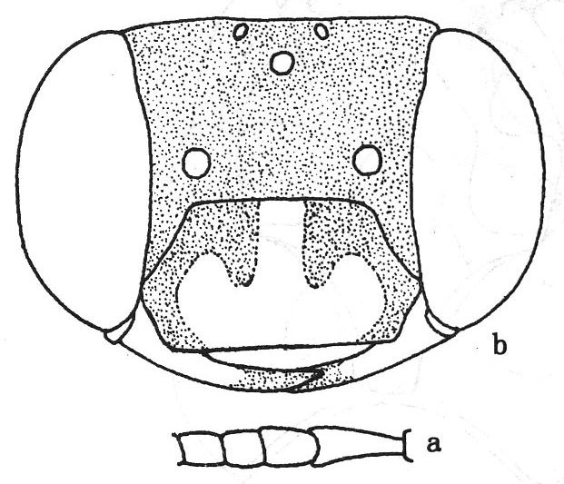 色。唇基隆起,基部刻点小而密,中央具乎为第2节的4倍,第1, 2, 3, 4节比例为23:6:7:10;胸部刻点密。唇基端部中央具一小三角形黄斑;上颗大部分褐色;触角鞭节暗褐色;翅浅褐透明,翅基片黄褐色;