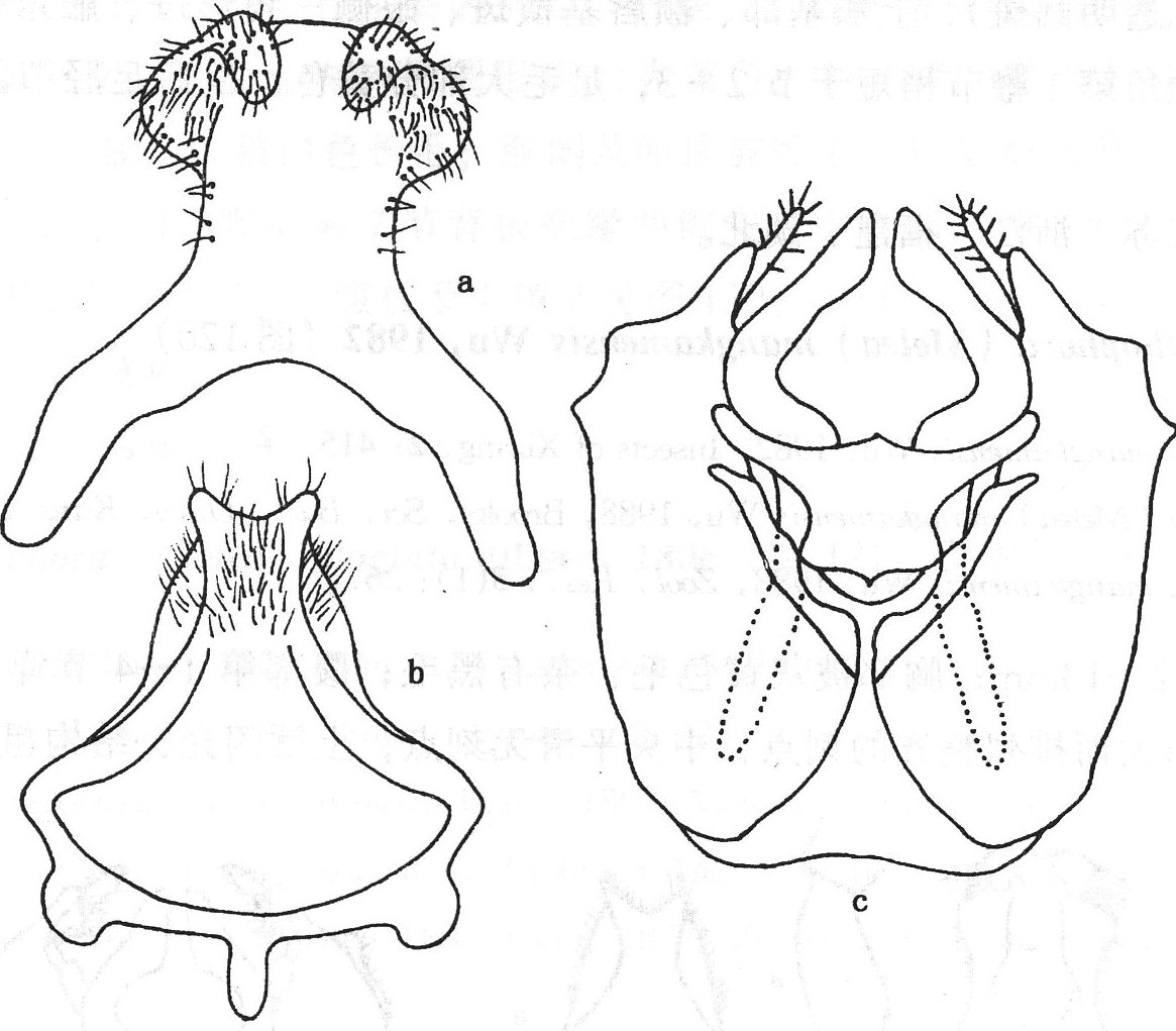 色长毛。唇基基半部刻点较稀,端部1/3处光滑无刻点;触角第1鞭节长于节2,等于节3;各鞭节下表面不具明显栉状;腹部背板刻点粗大,端缘光滑;第7、8腹板及生殖节见图40。上颚端半部