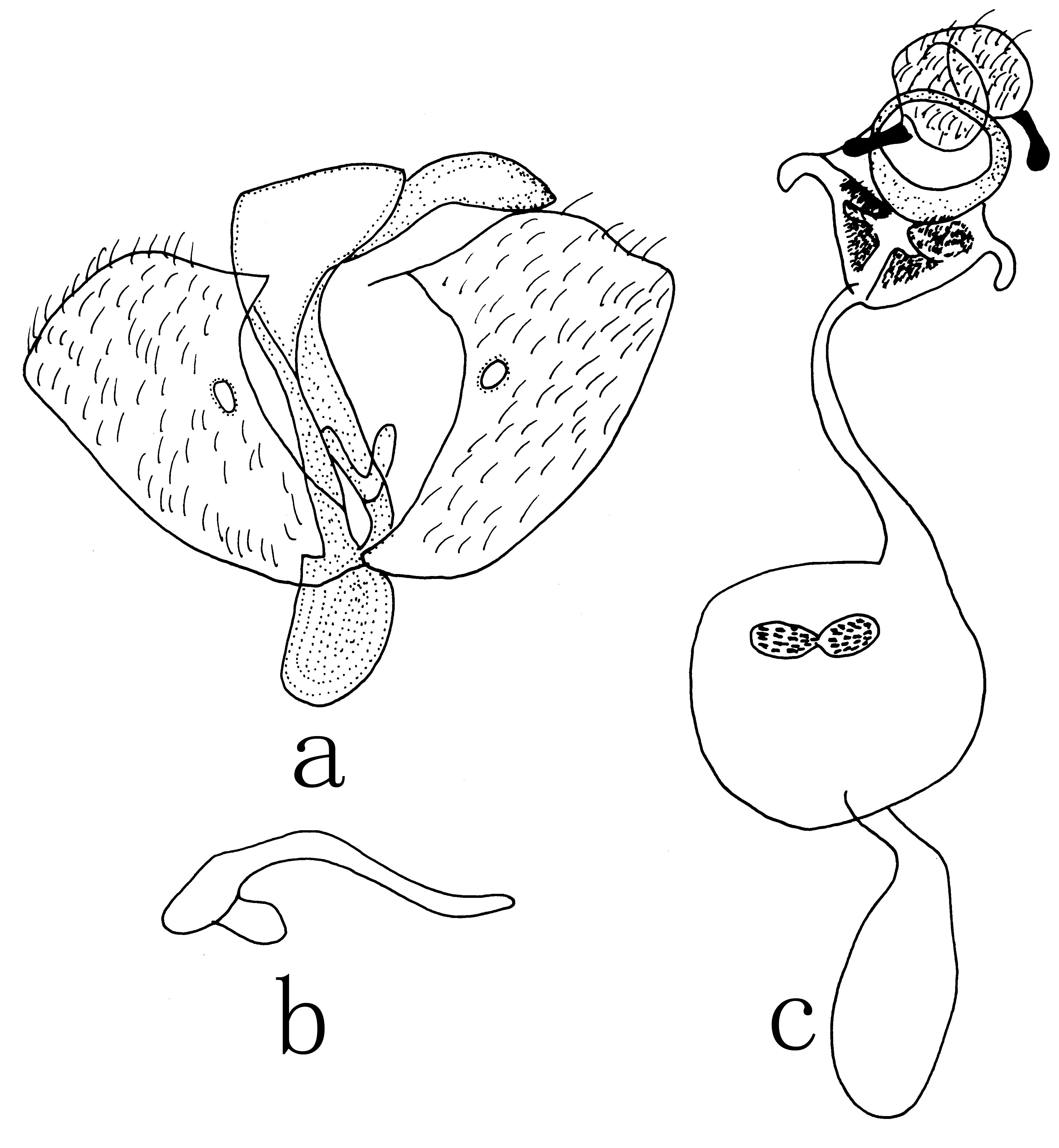 ,外形与R. bullifera相近似,但爪形突尖而无钩,抱器瓣上伸超过爪形突,囊形突稍圆,阳茎基环分为两个豆瓣状;阳茎粗短,顶端有许多小棘。
