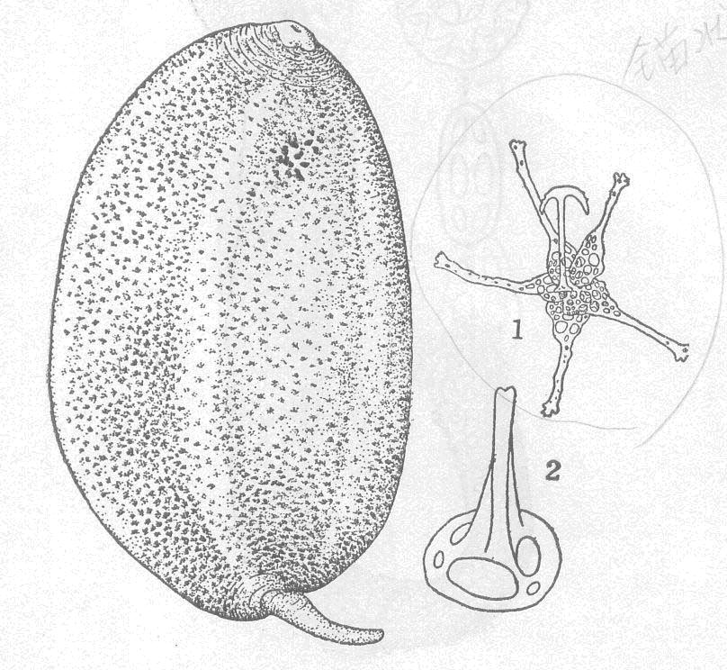贝壳较小,呈长卵圆形,壳质坚固。壳高18毫米,宽10毫米。螺层约8层,缝合线明显,螺旋部呈圆锥形,螺层较膨圆,体螺层稍大。壳顶光滑,其余螺层表面粗糙,上面生有发达而稍斜行的纵肋,这种纵肋在体螺层上有9—12条,壳面并具有明显的螺肋,螺肋和纵肋互相交叉使纵肋上面...