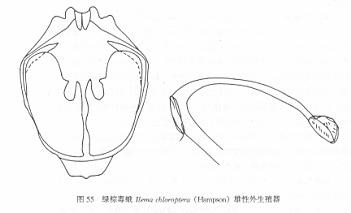 。前翅暗绿色,横线不清晰;内线、外线、亚端线、...
