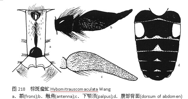 色毛,高为基宽的2.5-3.0倍,两侧平行或基宽略窄于顶宽,基胛黑色,近方形,两侧与复眼接触或分离,中胛矛形,黑色,与基胛连接...