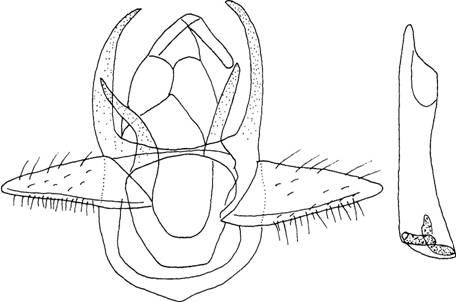 色。触角干赭白色,分支褐色。头部灰绿色。胸部背面灰绿色与褐色混杂,后缘绿色。腹部基缘黑褐色,其余部分浅
