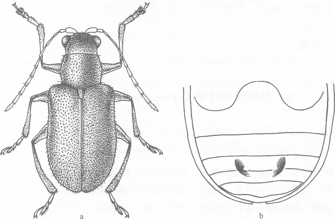 雄:头部具细刻点,前端,尤其在唇基处,较密;头顶具一条浅的中纵沟。触角丝状,稍短于体长;第1节粗