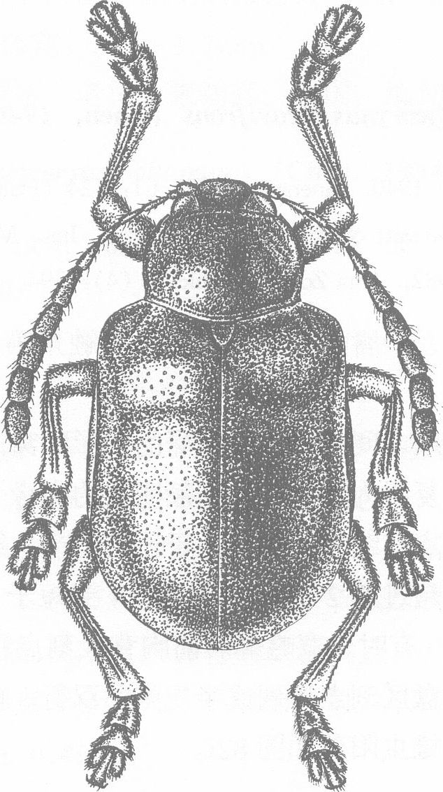 头部刻点疏,额唇基具皱纹和刻点,头顶十分隆起,复眼之间有一条深横沟。触角达体长之半,末端5节展宽。前胸近于锥形,十分隆起,光滑,刻点浅而稀疏。小盾片光滑...