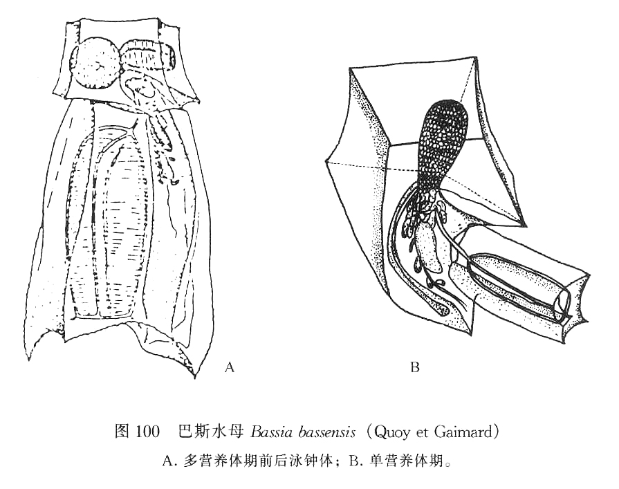 多营养体期:前泳钟体长3.3—4.2mm。约为后泳钟体长的1/2,这是本种与方深杯水母的主要区别。钟体呈五角柱形,