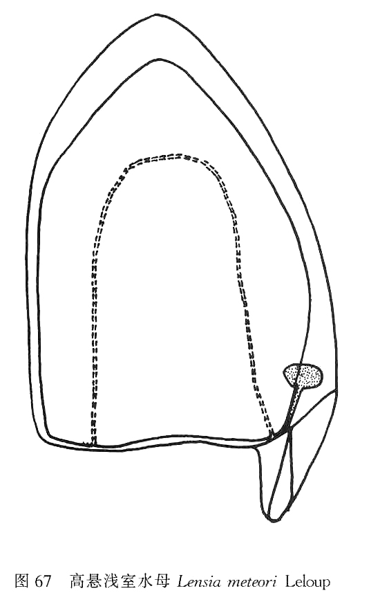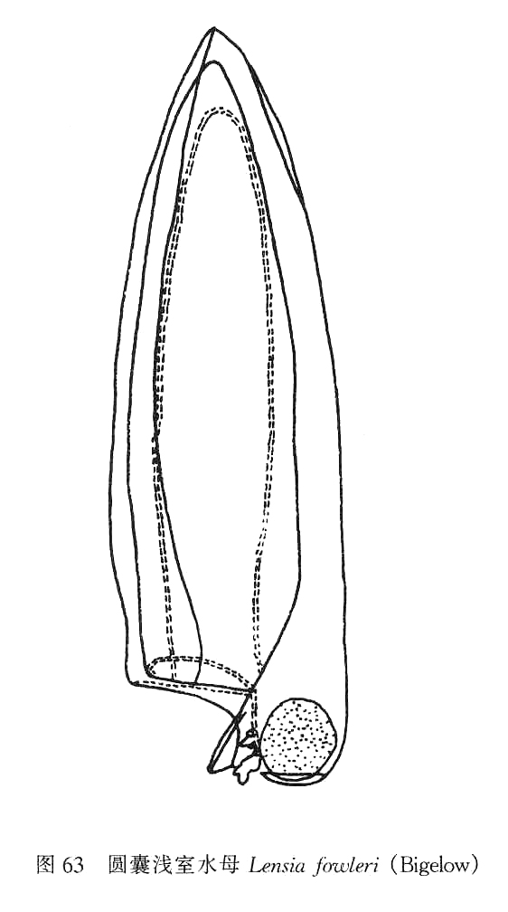 ,而有5条非脊状隆起,基底面几乎垂直的。干室极浅、口板大,分2叶,内缘重叠,侧面观末端尖,腹面观末端稍圆。体囊侧面观向两边突出,有的标本呈圆球形(图67)。