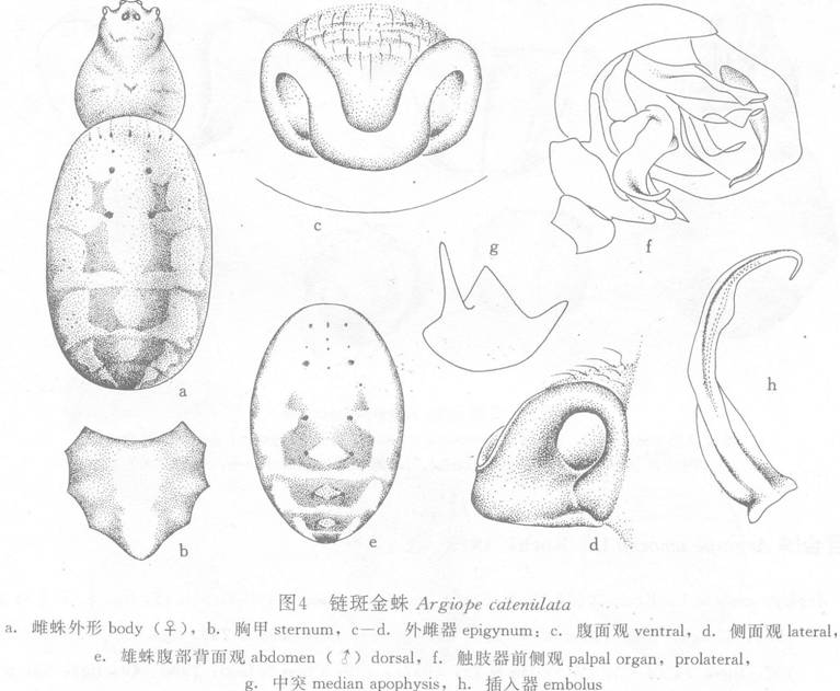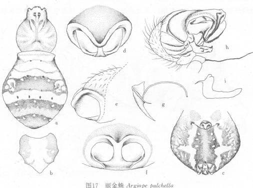 雌蛛体长11.50-- 18.00。体长14.80者,头胸部长5.50,宽4.80;腹部长9.00,宽7.OO。背甲黄褐色,上被白色绒毛,斑纹紫褐色。胸甲紫褐色,正中黄白条斑的中、后侧有侧支。螯基红褐色,前方有黑灰色长毛,前齿堤3齿,后齿堤2齿。触肢、颚叶、下...
