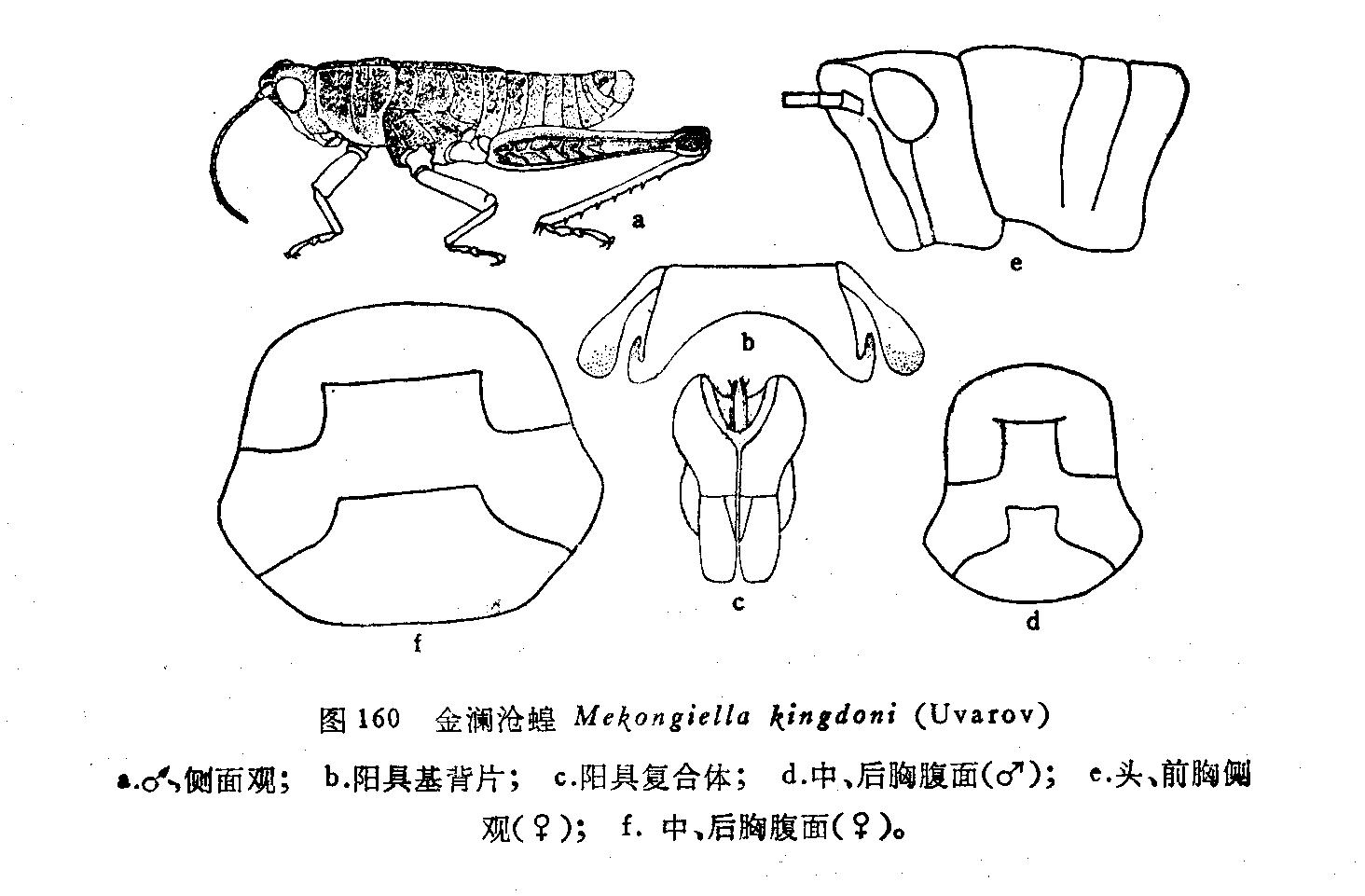 雄性 体型中等,体表具细小刻点和细隆纹。头大而短,较短于前胸背板。头顶较长,其在复眼前缘的宽度为长的1.8倍以下,前端中央具细纵沟。颜面侧观向后倾斜,颜面隆起中央具细纵沟,在触角之间明显地向前突出,靠近唇基处颜面隆起很弱。缺头侧窝。触角丝状,其长超过前胸背板...