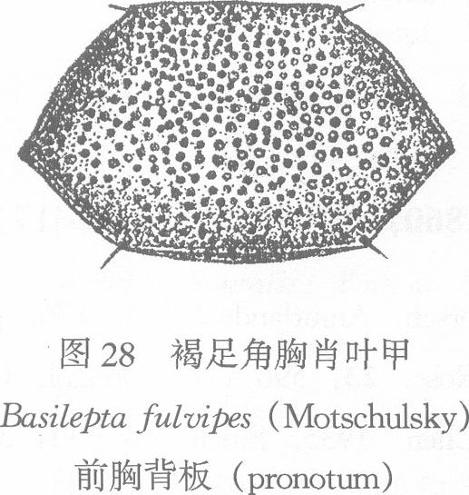 体长卵形,淡棕黄或污黄色。头部刻点细小、稀疏;额唇基前缘呈角状凹切。触角细,淡色,与身体约等长,第3节长于第2节与第4节约等长,第5节稍长于第4节而与后面各节约等长。前胸宽约为长的二倍;前胸背板侧缘中部突出成稍钝的角,盘区刻点集中于中部,两侧无刻点,前缘横凹深...