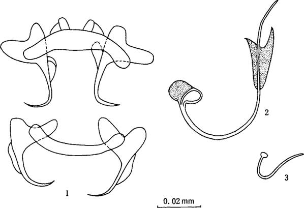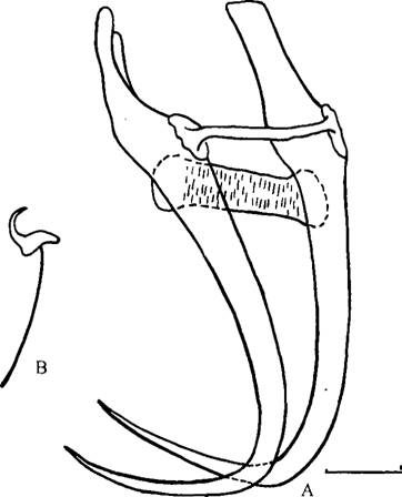 成虫形态 虫体长0.454-0.118mm。咽大小0.034×0.037mm,边缘小钩长0.022-0.026mm。中央大钩瘦长,其肩部突出,长0.055mm,钩尖长0.026mm,内突0.013mm。腹联结棒大小0.005×0.003mm。背联结棒大小0.001×0.016mm。
