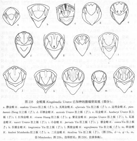 雄性 体型中等。颜面侧观向后倾斜,同头顶组成圆形。颜面隆起上部微缩狭,全长略呈沟状。头顶颇向前倾斜,中央略凹,侧缘隆起不显著。前胸背板前缘无凹陷,后缘中央具钝角形凹陷;较圆;中隆线在第1横沟之前明显,在横沟之间...