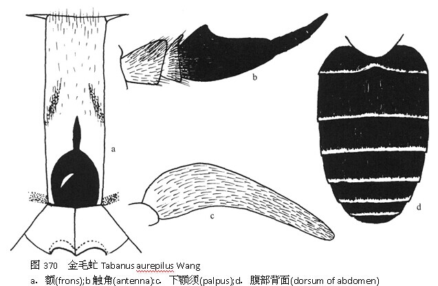 雌性体长15-16 mm,黑色。头部:复眼具1带(回潮);额灰色,着生黑毛,顶端略宽于基宽,高约为基宽的3.7倍;基胛黑色,圆形,两侧与复眼分离,与亚胛接触,中胛为基胛的短延线;亚胛土黄色,覆粉,“眉片”低;颜与颊灰色,上侧颜浅棕色,着...