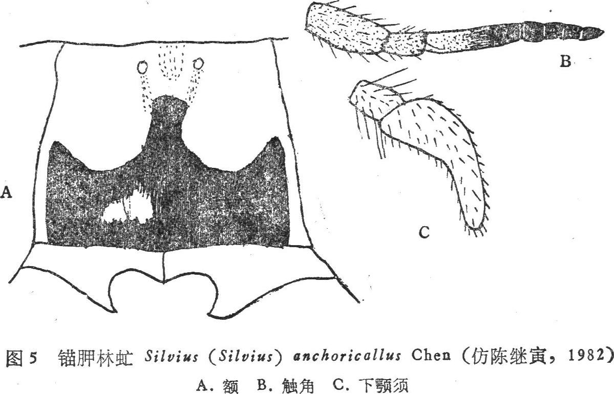 头部 复眼有稀疏的短毛。额浅黑灰色,并具短黑毛,甚宽,基部宽于端部,基部宽度大于高度。基胛具黑色光泽,大而明显,略似元宝状,两侧与眼分离。亚胛具灰色粉被。颊与颜具黄色粉被及黑色毛,其间杂有浅色毛。触角黑色,窄长,...