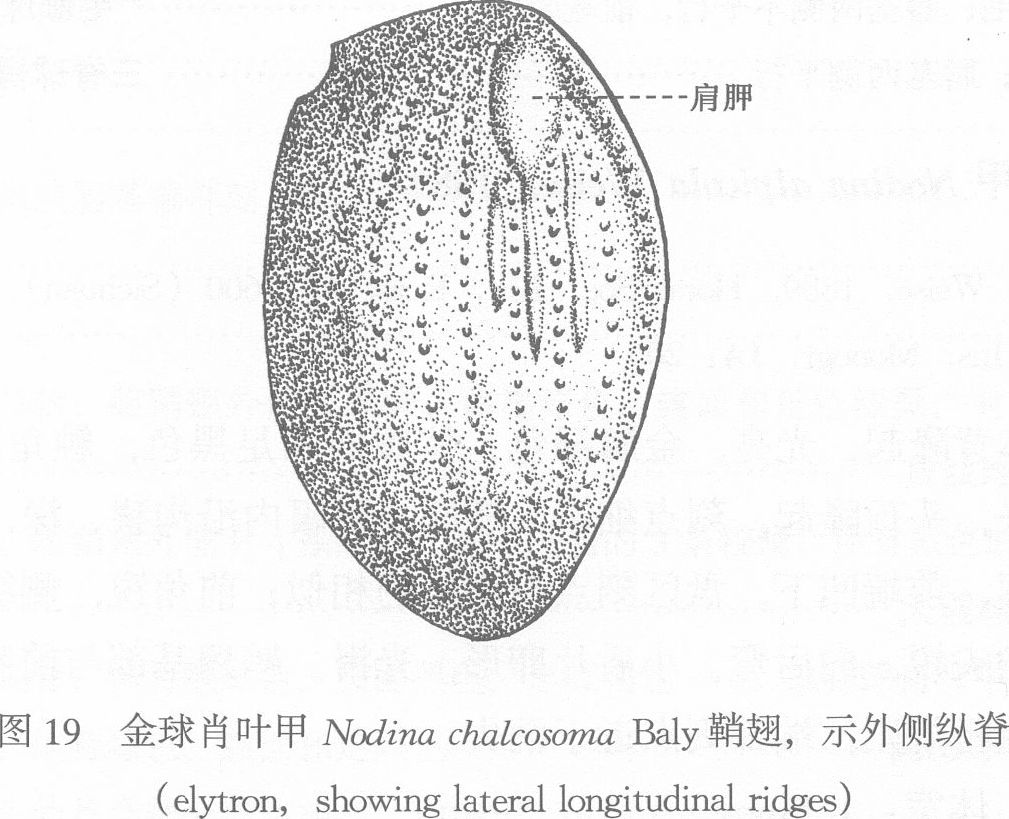 。体长卵形,体背一般蓝黑到漆黑色,具或不具金属光泽;头红褐色、光亮,有时头顶黑色;触角基节黄褐,端部5节烟褐色;足完全红褐色,或腿节黑色、胫跗节红褐;前胸前侧片全部或仅前半部红褐色。此外,有的个体全部红铜色,有的头、胸和小盾片...