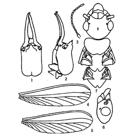 头似长方形筒状,两侧缘略直,后侧角略圆,头后缘微弯向后方,头前端截断状,额部突起甚显著,基部粗宽,顶端尖圆朝向前上方,侧观突起弯曲,先前伸,尔后转向上方,上颚对...