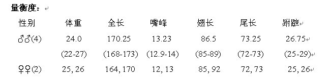 据De Schauensee(1984)记述:全长270mm,嘴长71mm,尾羽l6枚,最外侧尾羽变狭,约4mm。上体很黑,头顶中央冠纹不明显;从胸部至尾下覆羽满布规则的带斑,初级飞羽外翈暗褐;嘴基部橄榄褐,远端沾黑色;脚橄榄灰;翅长超过150mm。 ...