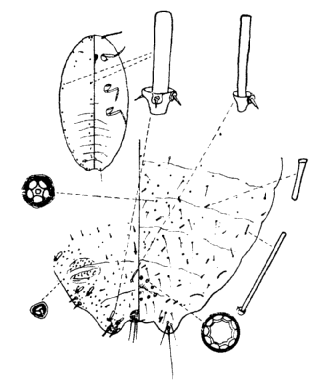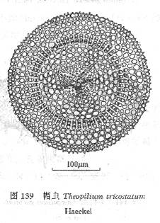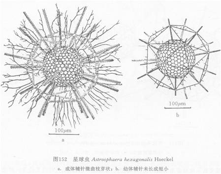,三翼形,自内壳桁条上生出,翼缘上生向前齿。外壳网孔多半呈正三角形,孔间桁有微曲枝芽状辅针(图152a)。幼体(图152b)骨针的小齿不明显,辅针亦稀少,外形与Haeckel的 Dipl...