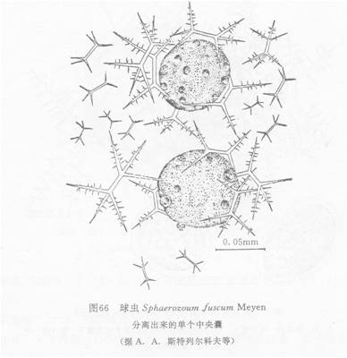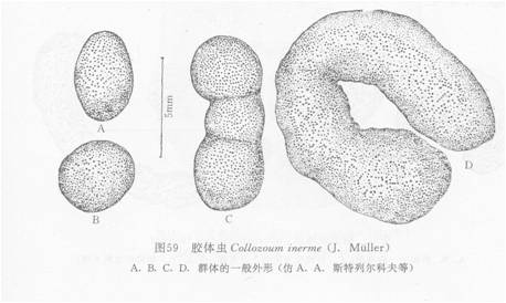 群体呈球形、椭圆形以至长条形(在此情况下群体有分节的特点)。中央囊球形、膜薄、内具脂肪球。