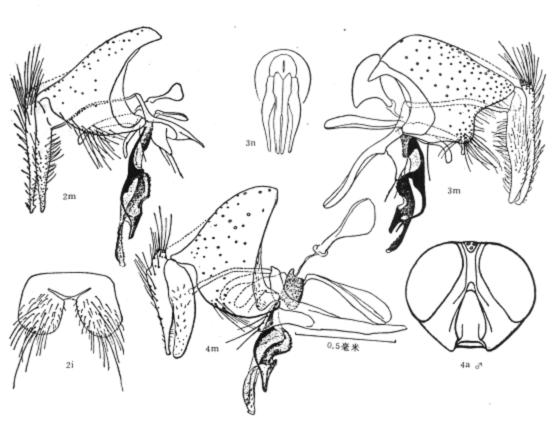 ♂:眼裸,额宽为头宽的0.07倍,又为前单眼宽的2倍强,间额暗棕,为一侧额宽的3/4,头顶暗色,头前面粉被包括下侧颜及颊前方金黄,下侧颜底色棕,颊底色黑;仅内顶鬃发达,无上眶鬃,下眶鬃10;列外侧有1—2行小毛,侧颜宽与...