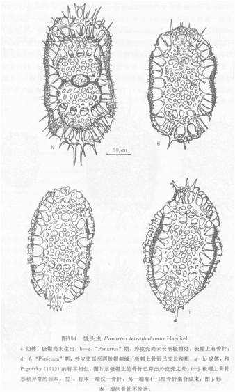 背面观:皮壳不规则,类圆形,大小约为透镜椭圆状髓壳的3倍,由若干放射梁与不规则格孔腰带相连,其间有4—8个不规则的类圆形门孔,壳表略有刺。