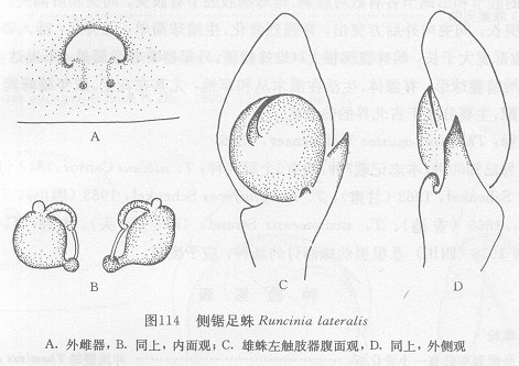 雌蛛长5.40—7.30毫米。背甲黄白色,中部有一白色纵纹,中侧部有两