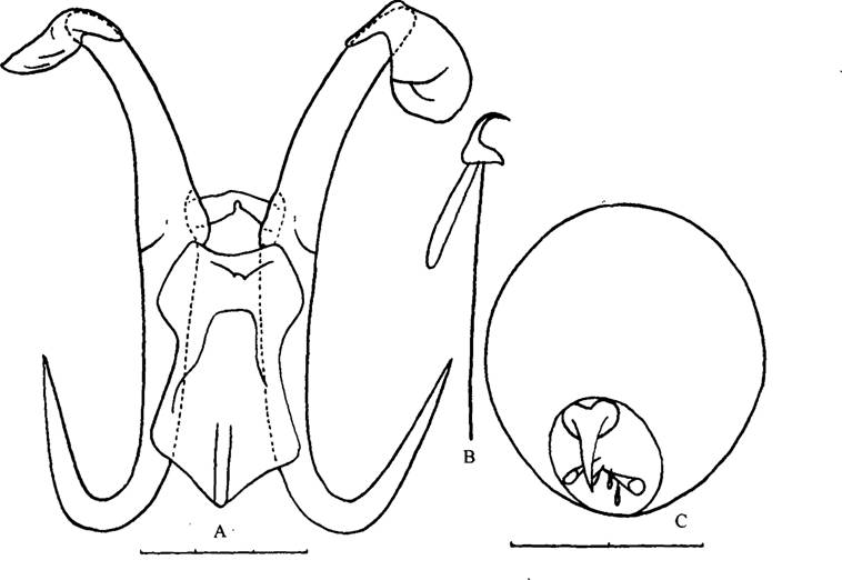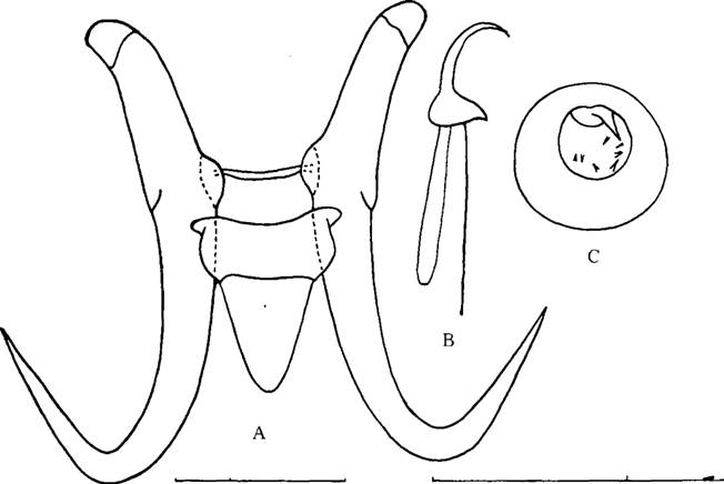 形态 体长0.5-0.9mm。边缘小钩全长0.025-0.037mm,钩体长0.005—0.007mm。中央大钩全长0.088---0.14mm,基部长0.068--0.084mm,钩尖长0.034—0.053mm,内突0.056---0.060mm。腹...