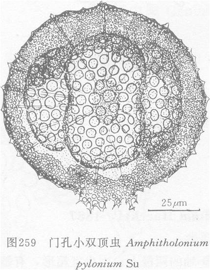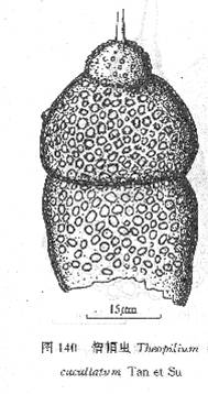 外皮壳呈椭圆形、平滑,与三节内壳的壳节大小变化不相应,具一小门孔,此门孔具编织状领。中央室有较高于两圆拱顶。外皮壳结构精细,具不规则类圆形孔。内壳壁厚,具亚规则排列、带有六角形框架的圆孔。放射梁约20—30
