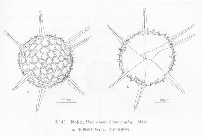皮壳孔呈圆形,大小相近,排列不规则,孔为孔间桁的2-4倍,孔问桁有高起的六角形框架(间或有五角形的),桁条的节点上生出短小的辅针。辅针锥形,不分枝(大多数已折断)。主针7