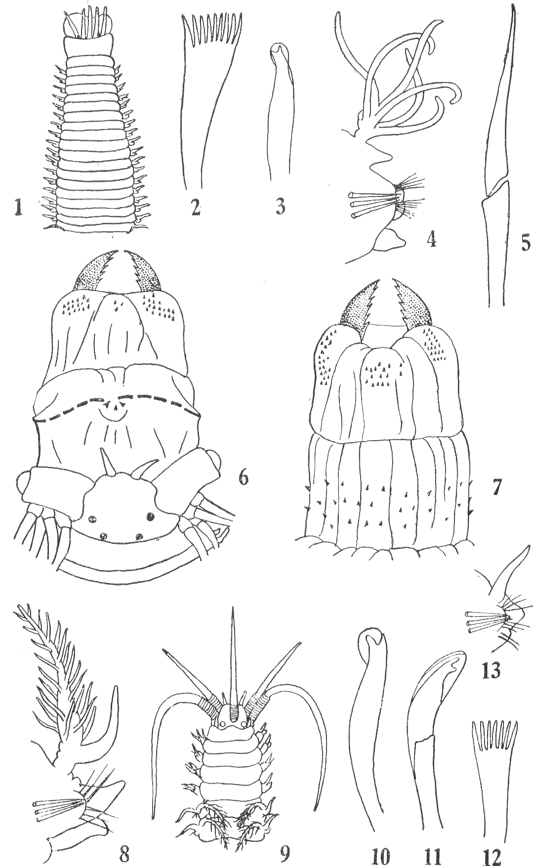 黄海的标本体很大,长可达290毫米,宽达11毫米。口前叶为双瓣形,其前緣具裂口。触手短,5个。鳃开始于第XXIV—XL节,止于体前端,具鰓絲4-7个。背刚毛为捆毛状;腹刚毛为复型,端节为刀形,位于体前部和后部。梳形刚毛的形状变化很大,位于休后部的較短,上具一些...