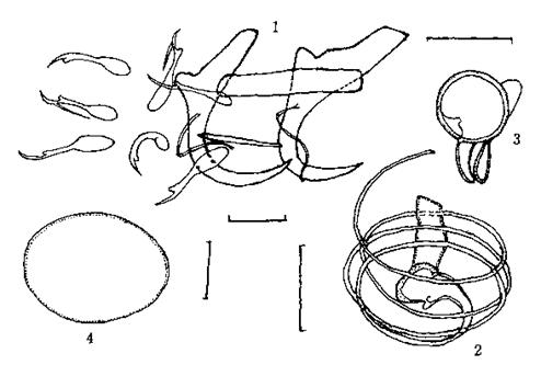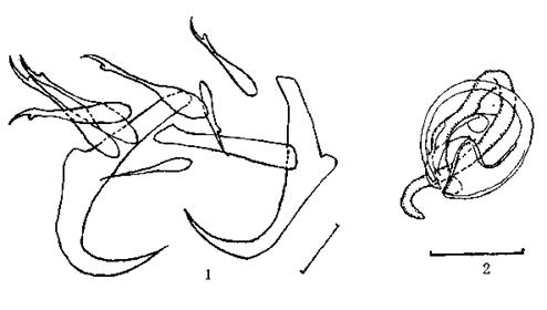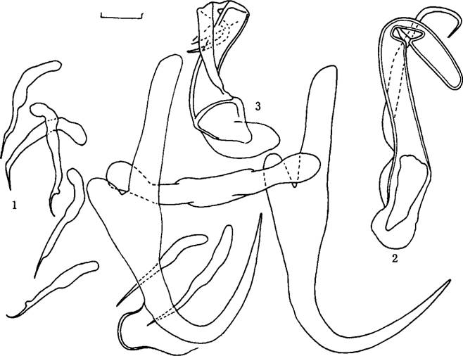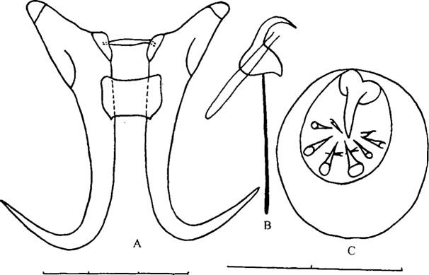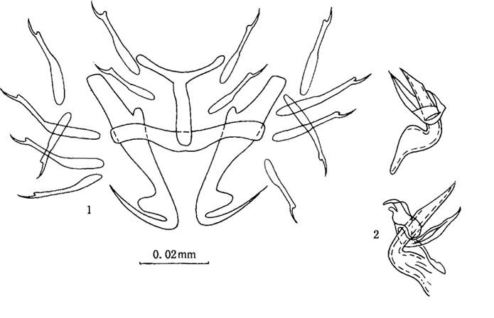 体,体长0.88mm,体宽0.029mm。边缘小钩全长0.027—0.034mm,中央大钩的一般长度0.068----0.082mm。联结片呈长棒状,大小为0.006—0.008×0.049----0.062mm,交接管长度达0.074mm,...