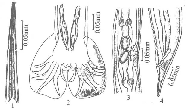 1.雌虫头部;2.交合刺和交合伞;3.雌虫阴门部;4.雌虫尾部
