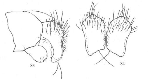 形态 ♂:体长5.5mm。眼疏生纤毛;额宽约为触角第三节宽的2.5倍;间额黑,约等于一侧额宽;下眶鬃约8对,鬃间有细毛,无上眶鬃;侧额和侧颜具浅灰色粉被;侧颜中部宽度等于或略宽于触角第三节宽;触角黑,第三节长为宽的2.7倍,芒羽状,最长芒毛约为第三节宽的2/...