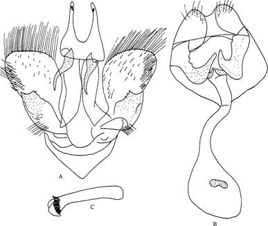 体长15~17mm;翅展♂38mm,♀45mm。下唇须黄褐色。头部和胸部背面褐色,颈板和翅基片苍褐色;后胸背面中央有2个灰白点。腹部背面暗灰褐色,基毛簇和臀毛簇苍褐色;腹面苍褐色。雄蛾前翅褐色,前缘和外缘后半部苍褐色,M1~M3脉间有1苍褐色楔形纹;中室下方有...
