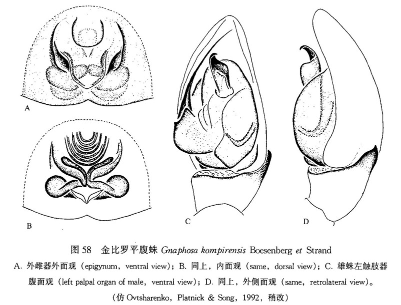 一雌蛛体长6.10:头胸部长3.20,宽2.20;腹部长2.90,宽2.10。背甲黄褐色,边缘黑色,后缘凹入。颈沟和网状放射纹明显;头区微隆起,前端色深,且两侧边缘黑色;中窝纵向,短棒状,黑色。8眼2列,背面观前眼列微后凹,后眼列后凹且长于前眼列。螯肢黄褐色,...