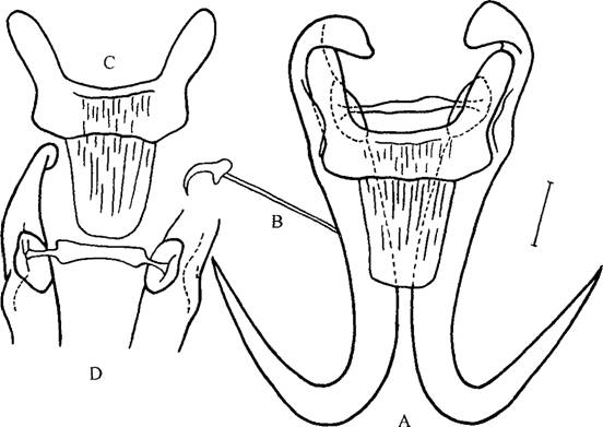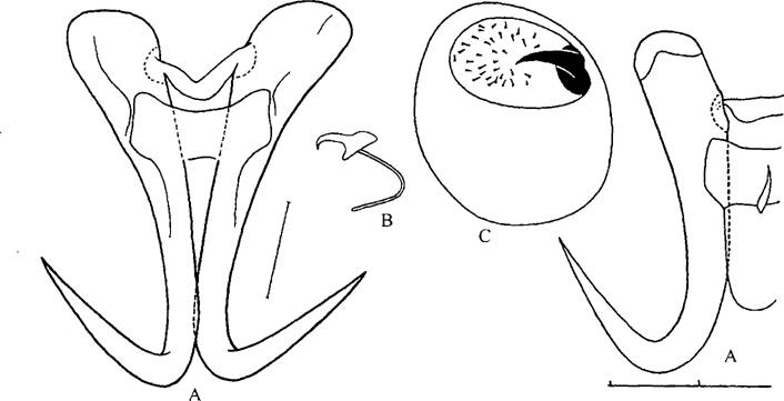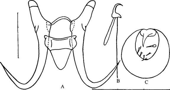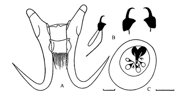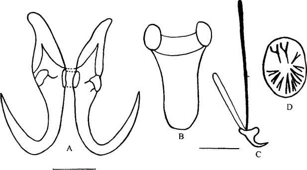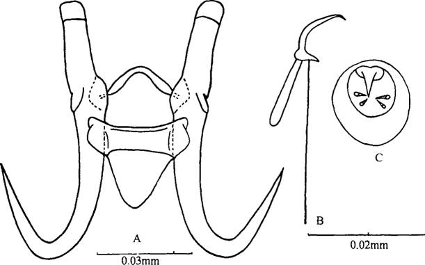 形态 体长0.75mm。边缘小钩全长0.035-0.037mm,钩体长0.009—0.010mm。中央大钩全长0.068-0.071mm,基部长0.047-0.049mm,钩尖长0.030---0.032mm,内突0.024-0.026mm。腹联结棒大小...
