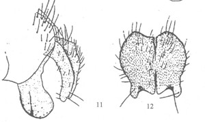 形态 ♂:体长6.0mm。眼密生浅色短纤毛;上中部的小眼面扩大;额略狭于前单眼宽(3:4);侧额褐色,间额和侧颜棕色;下眶鬃9对,上方4对毛状,无上眶鬃;间额在中段消失;侧颜狭,约为触角第三节宽的1/2;触角黑褐色,第三节长为宽的2.5倍;芒长羽状,最长芒毛...