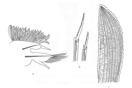 形态特征 体较短,长约6—15mm,宽lmm,易碎。头具 3 个触手,中触手短而细,侧触手末端细,基部呈球茎状。具两对圆形眼。口前叶后具一球状肉瘤。前两刚节仅具背稃刚毛,无腹刚毛。稃刚毛两侧不对称,呈宽弯刀状,末端尖,两侧具大小不等的锯齿,具 8—10 条纵...