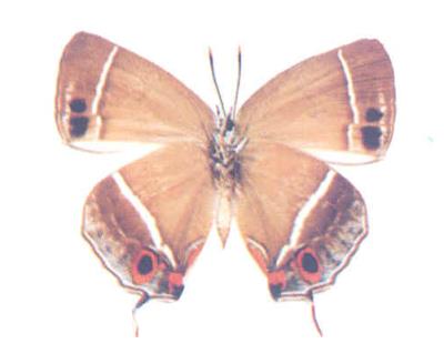 绿色,外缘带黑色,前、后翅等宽,前翅前缘黑带稍窄,后翅前缘宽于外缘,灰黑色,尾突附近外缘青白色细线发达。反面灰褐色,外线白纹显著,与外缘间及内侧阴影褐色,后翅cu1室椭圆形黑斑外环橙赤纹大,外缘白线显著。雌蝶前翅蓝青色,外侧黑褐色,中室端及m3室基部有橙斑或无。后翅褐色,反面比雄蝶色暗。