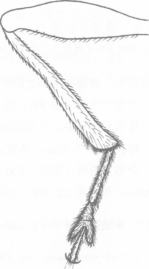 斑黑色;触角基部4节黄色,余节黑褐;腿节端部和胫节的部分淡棕黄色。