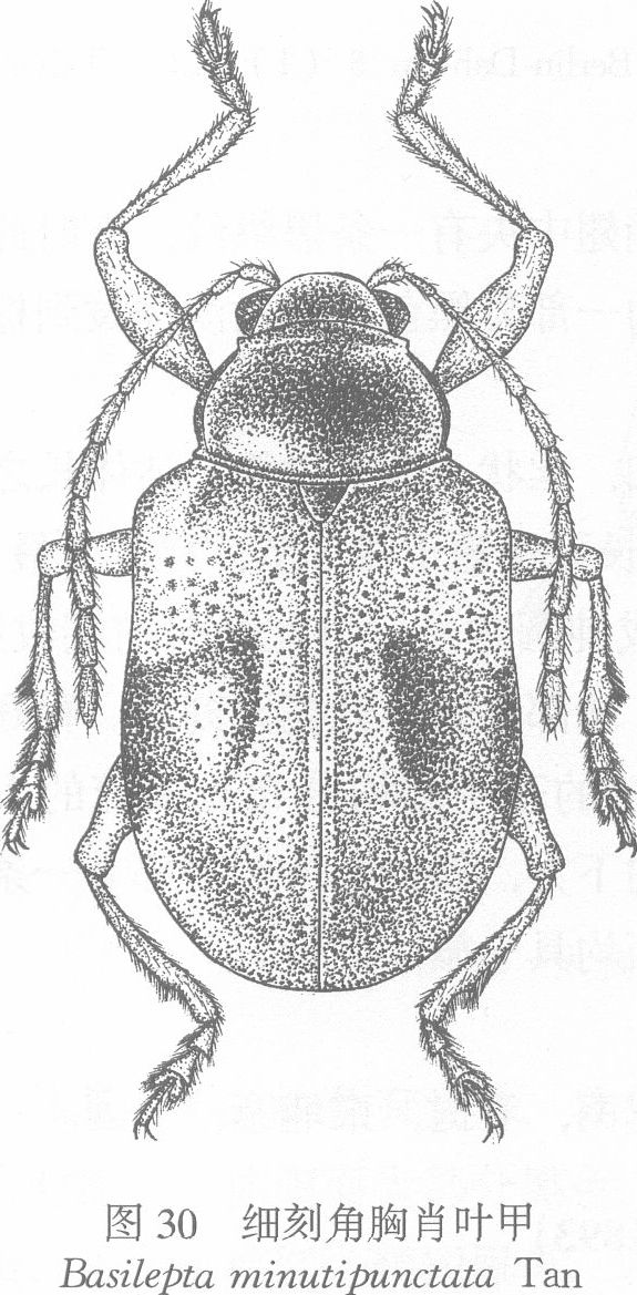 头部刻点密集呈网状,中间有一条纵沟纹;唇基与额之间有一条横凹,唇基前缘凹切,表面密布刻点。触角丝状,约为体长的l/2;第1节粗,稍弓...