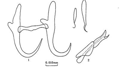 形态 边缘小钩全长0.0 1 7—0.024mm.中央大钩尖细,外突比内突短4倍,全长0.042mm.联结片一字形,大小为0.004×0.021 mm.交接器全长0.030mm.