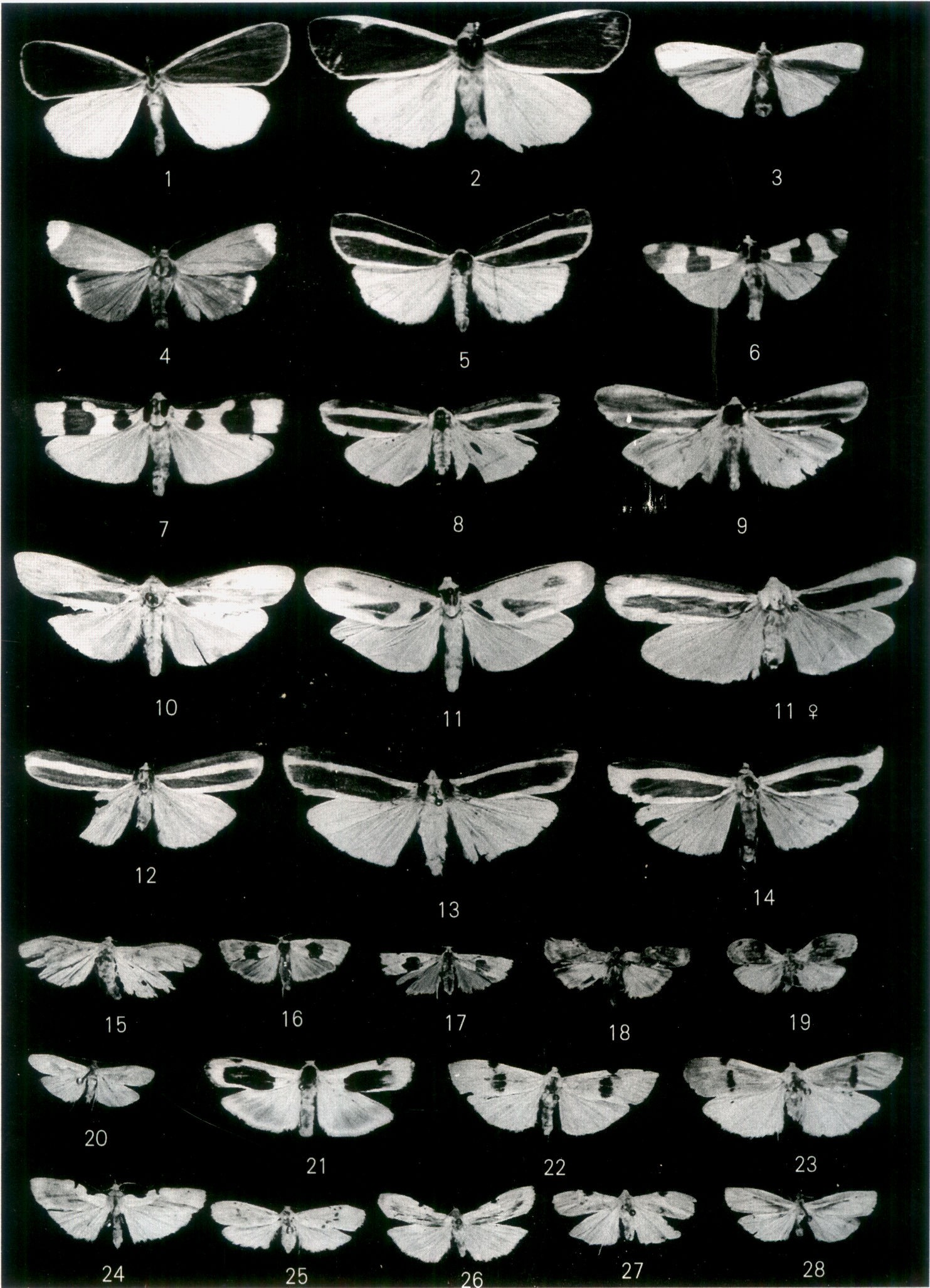 翅展35—41mm。头、胸、腹黄色,额及触角黑色,下唇须黄色、末端黑色,翅基片黑色、其边缘有黄毛,足基节黄色,腿节基部及内侧黄色、腿节外侧及胫节、跗节黑 色;前翅黄色,前缘带黑色从基部达外缘,后缘上方黑色纵带从近基部至近外缘,二带 宽度较均匀,前翅反面黑带...