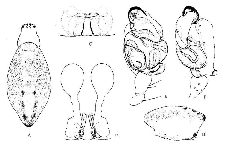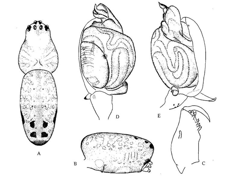 雄蛛体长2.45~2.48。一雄蛛体长2.48:头胸部长1.09,宽0.88;腹部长1.60,宽0.82。背甲浅黄褐色,颈沟稍前方具一黄褐色斜纹。颈沟和放射沟颜色稍深,但放射沟不明显。中窝较浅,略呈三角形,黄褐色。两眼列均后凹,各眼均有明显的黑色眼斑。前中侧眼...