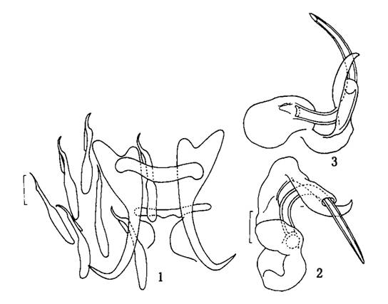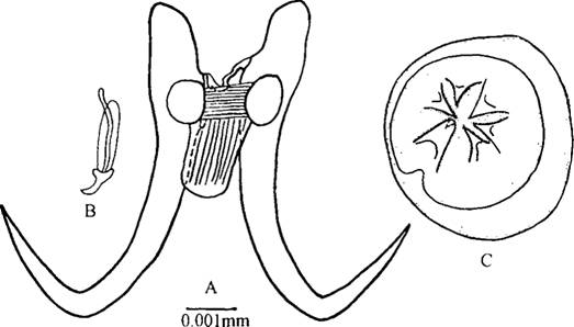 边缘小钩全长0.029—0.039mm。中央大钩全长0.040—0.047mm。联结片呈一字形,两端向一侧突出,大小为0.004—0.008×0.027—0.037mm。副联结片0.00...