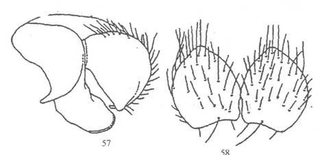 形态 ♂:体长6.0—7.0mm。眼疏生短纤毛;额为前单眼宽的1.5倍,间额在上段消失;侧额、侧颜具白粉被;下眶鬃4对,无上眶鬃;侧颜为触角第三节宽的2/3;触角基部两节棕黄,第三节暗,长为宽的2.5倍,为第二节长的2倍;芒长羽状,最长芒毛略超过触角第三节宽...